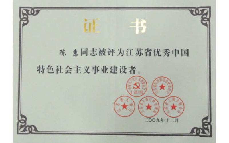 2009年12月,陳惠董事長榮獲江蘇省第四屆“優(yōu)秀中國特色社會主義事業(yè)建設者”稱號。