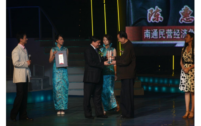 2007年3月30日,南通更俗劇院。南通民營經(jīng)濟爭創(chuàng)“名企、名品、名人”2006年度人物頒獎晚會隆重舉行。會上,通過初評、公眾投票、專家組評定等程序評選出的12位民營企業(yè)家受到表彰,陳惠董事長榮列其中。南通市政協(xié)主席曹能新為陳惠董事長頒發(fā)榮譽證書和獎杯。